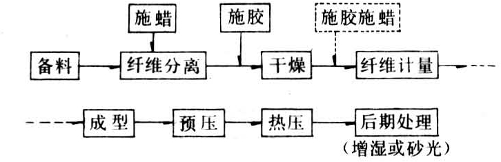 以气流为载体输送纤维以使板坯成型制成的纤维板。该法生产纤维含水率在10%左右,需加胶粘剂使纤维结合。产品两个表面均光滑,不存在废水污染问题。干法纤维板生产工艺如图。 干法纤维板生产工艺流程图 纤维分离纤维特性和生产工艺是确保产品质量的关键因素。干法生产的纤维浆料多采用一次磨浆,纤维滤水度以20~30秒为宜。纤维分离过细,其比表面积加大不仅影响胶粘剂的消耗,且使成型和加压时板坯中气体难于排出。
