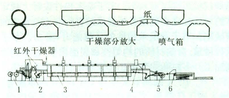 ①卧式浸渍纸干燥机根据用途和工艺要求可设计成不同的浸渍方式:不对称浸渍法。先对纸的一面进行浸渍,然后再进行双面浸渍。复合浸渍法。该类浸渍干燥机的浸渍槽有两个,分别盛放不同的树脂浸渍液。纸经一次浸渍后,就进入渗透区的中间干燥,然后经过第二次浸渍再进入干燥段。无论采用何种浸渍方式,卧式浸渍纸干燥机均由纸卷放卷、浸渍、干燥、冷却、卷卷或剪切等部分组成。下图所示为采用第二种浸渍方式的干燥机。被浸渍的纸进入第一级涂胶辊时,先涂纸的底面,胶辊将胶液挤涂入纸纤维中的同时将纸纤维中的空气挤出,从而使胶液以较快的浸润速度被纸吸收。第一级浸渍后的纸经红外线烘干器将涂上的胶液烘干。被浸渍的纸进入第二级涂胶段后,纸的两面均浸渍上适量的胶量。浸渍结束后的纸进入干燥部分时,纸的上下两面分别受到从喷气箱中吹出的热气流作用而漂浮在喷气箱之间并很快地被干燥。卧式浸渍纸干燥机的生产效率较高,浸渍干燥速度约为23~36米/分。其浸渍部分由导向辊、张紧辊、浸渍胶槽、增湿辊、呼吸辊、中间干燥、浸渍辊、剂量辊等装置组成。浸渍辊用于控制纸的浸渍时间,辊间的距离可随时进行调整;剂量辊主要起控制胶量的作用,辊径和间隙要有较高的精度。性能优异的浸渍纸干燥机配有高精度的自动调节剂量辊的装置。上述浸渍机构较为复杂,但也可以根据用途设计较为简单的浸渍机构。干燥部分一般由一个或几个结构相同的干燥分室组成,各个干燥分室的工艺参数可以独立调整。经加热器加热的热空气由高效率风机鼓入喷气箱,经喷嘴喷向运动的纸带的上下表面。在干燥室的纸带进口和出口处有为防止干燥室热量的散失而由专门系统形成的空气幕。新发展的大型卧式浸渍纸干燥机配有各种自动记录和测量、控制仪表,是一种高效、连续自动作业线。对各种纸张和织物均可浸渍及涂布加工。②立式浸渍纸干燥机的结构与卧式浸渍纸干燥机基本相同。不同的是干燥部分是垂直布置的。在纸的前后两面布置散热器。纸通过时需垂直牵引,纸受到的拉力较大,所以对纸的湿张强度要求较高。此种类型的设备其生产效率比卧式浸渍纸干燥机低。但占地面积较少,能充分利用空间,这是一个较大的优点。