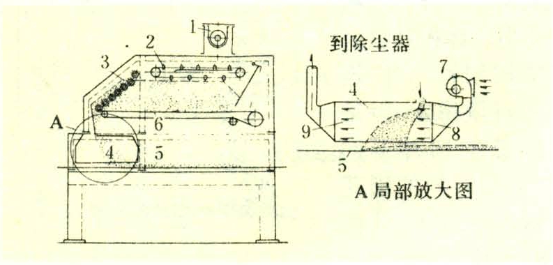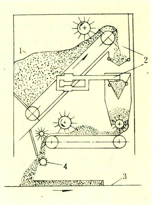 结构如图1。料仓在铺装机中起均衡供料的作用。如果前一道工序出了故障,短期停机,铺装机仍可利用料仓内的存料继续铺装。同时料仓中的输送带还能保证刨花在铺装宽度上均匀分布。由于这输送带的搅动作用还可以将先后进入料仓的在含胶量、含水率和形状尺寸、树种有一些差异的刨花互相轻微地混合,从而使待铺装的刨花料流的性质更趋一致。