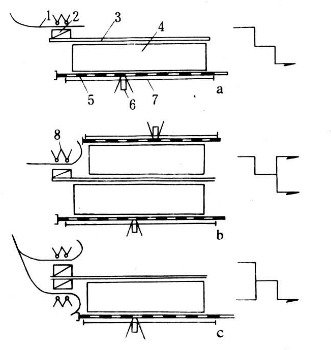涡流是在工艺流程中的某处,一部分木材脱离主流转了一个弯又回到主流的现象。分顺涡流和交涡流两种。①顺涡流:指木材涡流不与主流相交(图2)。例如,造材后的制材原木,一部分直接进厂锯截,而另一部分暂时归入楞区,待需要时再向输送机装载供应给制材厂。②交涡流:指木材涡流与主流立体相交。例如在双面选材、单面归楞的工艺布局中,选入外侧编捆框中的原木用装卸桥吊起归楞时与选材主流相交。涡流现象可能在一个流程中多次出现;顺涡流或交涡流也可能在同一流程中同时出现;一个交涡流也可能会与主流多次相交。涡流主要用于建立木材的贮备,改善主流的流通,压缩场地的面积等场合。在设计这种流程时,务必使参与涡流的木材数量最少,行程最短,形成涡流的场地集中。