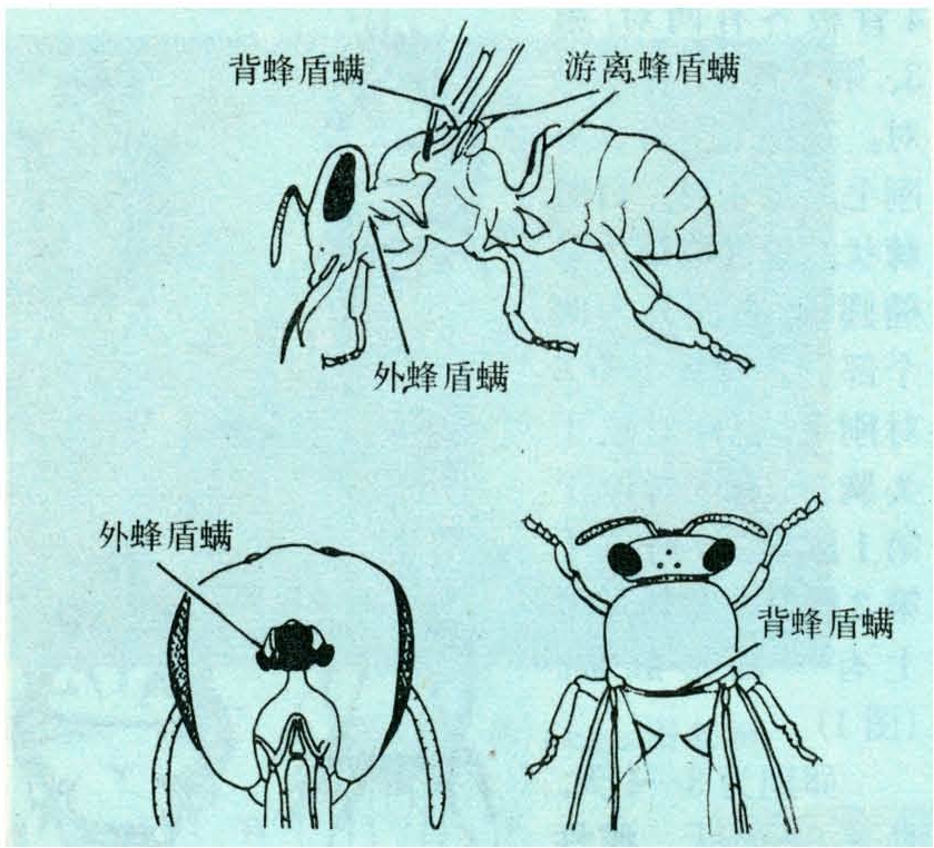 外蜂盾螨、背蜂盾螨、游离蜂盾螨通常在羽化出房第2天的幼蜂身上产卵,4天后卵孵化为若螨。雄若螨经过两三天变为成螨;雌若螨经过4天变成成螨。因此,雌性成螨的生活周期约需10天,比武氏蜂盾螨少4天左右。在1年中,以冬季的寄生率最高,仲夏季节最少;在蜂群中以幼蜂最易感染。但当蜜蜂死亡以后,无论处于哪种虫态的螨,经3天即死亡。它们对蜂群的危害及所造成的经济损失并不大,仅受害蜜蜂容易感染麻痹病。