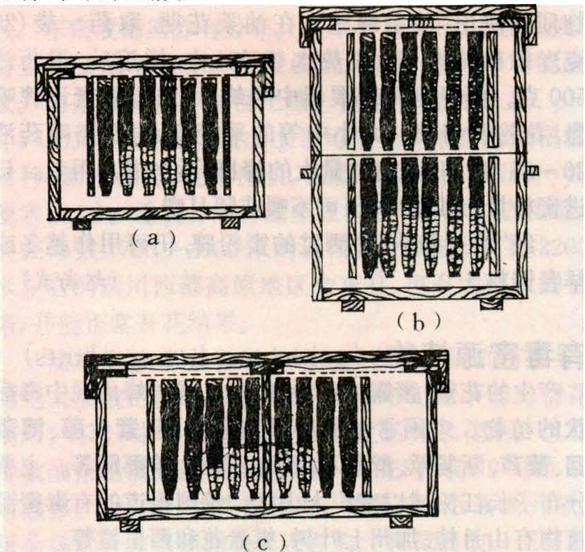 蜂群安全越冬必须具备的基本条件:①具有优良蜂王和以适龄越冬蜂为主体组成的强群。②越冬饲料充足,质量优良,蜜汁成熟封盖。③蜂群健康无病。④越冬环境安静,蜂巢布置合理,包装正确。越冬准备工作包括:更换蜂王,防治蜂螨,培育适龄越冬蜂,贮备饲料(见秋季管理)及布置越冬蜂巢等。秋末,蜂子全部羽化出房之后,蜜蜂停止出巢飞翔之前布置越冬蜂巢。首先,抽出巢内的空脾及多余的半蜜脾和花粉脾,补以成熟蜜脾,然后将半蜜脾置于中间,两侧放整蜜脾,外加隔板,促使蜜蜂以蜂巢中间下部为核心结成冬团。越冬蜂巢应适当加大脾间蜂路,上梁横放几根木条或盖纱盖,留作上蜂路,以便蜜蜂利用贮备饲料。双箱体越冬时,上下箱体放置脾数相等,蜂路相对,下箱体放半蜜脾,上箱体放整蜜脾。双群同箱越冬时,蜂箱中间用闸板隔严,靠闸板两侧放半蜜脾,外侧放整蜜脾(图1)。巢内饲料贮备量根据越冬期的长短和群势而定,高寒地区越冬期长,每框蜂留3千克以上封盖蜜和适量花粉。布置好蜂巢后,不再开箱检查,尽量保持蜂群安静。