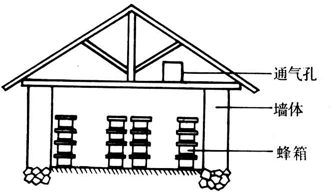 可人为调节环境条件,既安全,又便于管理,但设备投资较大。越冬室要求保温性能良好,温差小;干燥,防雨雪;通气良好,便于调节温度;安静黑暗(见越冬室)。有条件的蜂场可建立自动调温通风的现代化越冬室。蜂群入室的时间一般是白天荫处不再化冻、水面结冰之后。出室时间依早春气温回升情况而定,当白天最高气温达到8~10℃时即可出室。蜂箱在越冬室内的排列,应离墙壁20厘米,地上设40厘米高的支架,支架上面可放置3层蜂箱;成行排列,行间留80厘米通道;巢门向外,以便于管理(图3)。蜂群在室内越冬的适宜温度为-4~4℃,相对湿度75~85%,并要通气良好,空气新鲜,安静,黑暗。在越冬室的不同高度分两三处设温、湿度计。蜂群入室初期,每日观察一次,开大通气孔,使室内保持较低温度;越冬前中期,如果室内温度稳定,蜂群安静,每10~15日进室观察一次。若室温高则开大通气孔,通风降温,如室温过低,则缩小通气孔,提高温度。湿度过高,加强通风或在地面分撒吸湿剂;湿度低可在地面洒水(见蜂巢温度、蜂巢湿度)。越冬正常的蜂群发声很小,如果发现个别蜂群发声过大,应开箱检查,发现问题及时处理。发生鼠害应立即捕灭。越冬中期以后,每月从巢门处清理一两次死蜂,避免堵塞巢门。越冬后期,蜂群开始产卵育虫,巢温升高,耗蜜增加,每3~5日观察一次,临出室前普遍开箱检查一遍,发现缺蜜,须及时给蜂群加蜜脾或饲喂,如果蜂团周围无蜜,应调整巢脾,缺粉群可补加粉脾或饲喂代用花粉(见配合饲料)。对个别下痢群可选温暖天提前出室,促使蜜蜂提前出巢作排泄飞行,并更换被污染的蜂箱和巢脾。