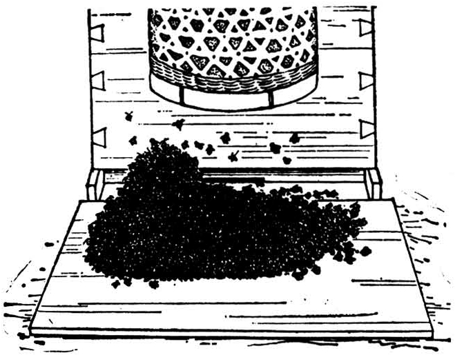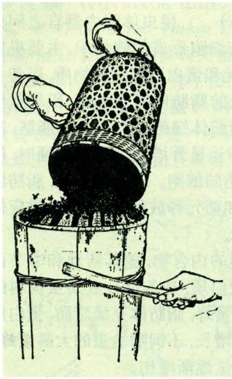 过箱操作宜三人协作进行。由于蜂群栖息的蜂桶形式不同,在过箱方法上略有差异,但操作程序上基本一致。①驱蜂离脾:先将蜂桶外围清理干净,轻轻启开固封物。对直立式蜂桶,即把蜂桶顺巢脾平行方位翻转,使底面开口向上。将收蜂笼盖在口上,四周最好用布等堵严。用木棒轻击桶壁或喷淡烟驱赶,促使蜜蜂离脾上爬,逐渐集结在收蜂笼里(图1)。待蜂在收蜂笼中结团后,将收蜂笼提起,悬挂(或垫高)在蜂箱上方(事先把蜂箱放在蜂桶的原位置),然后割脾。对横卧式蜂桶,如能打开一端,也可用上述方法进行。如两端无法打开,可取去捆绑物,轻轻启开中缝,看清巢脾位置后闭合,抬高空虚的一端或翻转,用木棍敲打有巢脾的一边或喷烟,驱赶蜜蜂至空处结团,然后打开蜂桶割脾。对土窑或墙洞中的蜂群,可先轻启前档板,察看是否与相邻土窑有小孔相通,如果有小孔,仍放好档板,从巢门口向内喷烟,驱赶蜜蜂到相邻土窑中结团,再打开档板割脾。如系单一土窑,可设法将蜂驱到空处结团后割脾。②割脾、绑脾:割脾时用刀面紧贴巢脾基部下刀,用手托脾取出,扫去剩余工蜂,置于平板以供装框、绑脾。装框时首先把巢脾基部切平,紧贴上梁内侧,再用小刀紧贴铅线轻划,深及巢脾单面房底,然后将铅线嵌入切口内。铅线全部嵌入房底后,将巢框上梁向下竖起,用麻绳等采取插或吊的方法将巢脾绑牢在巢框上(图2)。绑好的脾随即放入箱内,以免冻伤幼虫或引起盗蜂。在蜂箱内,将大子脾摆于中央,较小的依次摆放两侧,形成类似自然蜂巢中的半球形。巢脾间保持7~10毫米的蜂路。③抖蜂入箱:巢脾全部绑完后放入蜂箱内,加外隔板,缩小或关上巢门,即可将收蜂笼内的蜂团抖入蜂箱(图3)。抖蜂时,笼口对准蜂箱,以防抖在箱外。抖蜂后立即盖上箱盖,待箱内声音较小后再开巢门,使分散在蜂箱外的工蜂自行爬入。蜂群入箱后放回原蜂桶位置,巢门开向也与原巢一致。若原群是在土窑或墙洞内,过箱后可将蜂箱放在靠近原巢门处。过箱操作完成后清扫场地,用清水冲洗地面和蜂箱上的蜜汁,以防止发生盗蜂。