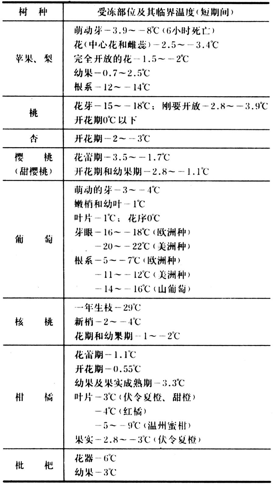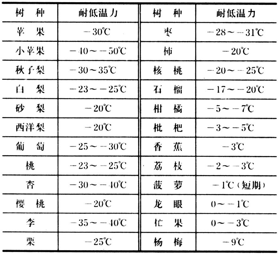 不同树种、品种的抗寒力,由遗传因子所决定(见表1)。苹果、梨、山楂、李、杏耐寒力较强,可耐-25~-40℃的低温;桃、栗、核桃、枣次之,可耐-25℃的低温;樱桃、洋梨、葡萄、石榴、柿抗寒力较差,耐低温能力在-20℃以内;柑橘类果树耐-5~-10℃低温;枇杷、香蕉、龙眼、荔枝等果树的耐寒力都很差,-2℃即有严重冻害。同一品种植株遭受冻害的程度,取决于低温程度、持续时间、冻害发生时期、果树生长状况及所处的地形、地势位置。果树不同器官的受冻临界低温(见表2)。