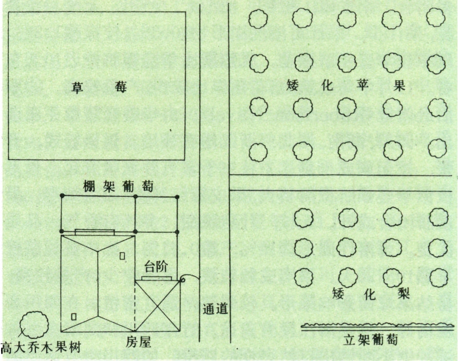 庭院栽培树种不宜多,每种数量也宜从少开始,待积累经验后,逐步按需要扩大;对有共同病虫害,或相互禁忌的树种,不宜就近并栽;以观赏为栽培目的时,可以使果树与观赏植物或蔬菜适当配栽或间作(见图)。作为生产性庭院栽培时,宜采取联户集中种植一、二种果树。行向以东西行为好,高、矮树种南、北错开。同时,要通过修剪控制树冠或架面,防止彼此竞争空间,影响光照;庭院栽培日久,病虫就会滋生蔓延,应及时注意防治。