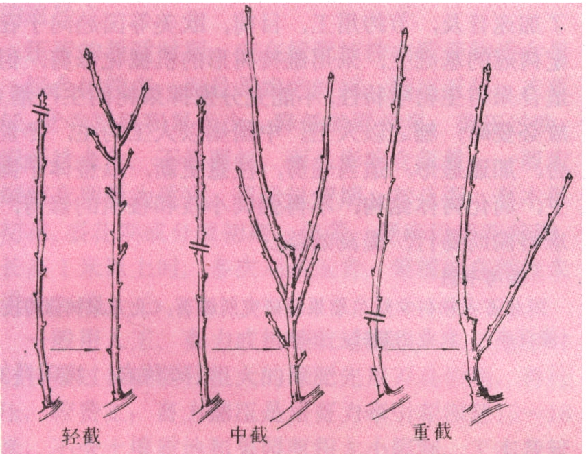 剪去枝条的一部分(图1)。枝条经短截后,可以增强剪口芽的生长势。轻短截对原枝条的刺激较小,剪口芽不会发生强旺枝,但下部芽受抑较轻,萌发较多。一般在培养中小型枝组,或希望减缓生长势时采用;中短截的剪口芽为饱满芽,能促发长枝,和少量中短枝,一般对骨干枝的延长枝,中、大型枝组的带头枝,以及希望填补空间时采用;重短截常能促发几个旺枝或徒长枝,使局部生长势得以加强,这种效应与增施氮肥相似。因此,仅在控制枝组或平衡树势时采用。重短截虽然能促生强旺枝,但由于被剪去的枝段也较长,树冠相对被缩小,枝条中贮存的营养也有所损失,所以对植株的整体是一种削弱。对幼树和壮树重短截愈多,对剪口芽的促进愈明显,但对全树总生长量、总叶量则愈减少。对整个树势的削弱也明显;对老弱树适当重剪,则由于增加了根/冠比,使贮藏营养集中使用,反可以促进新梢萌发,树势复壮。