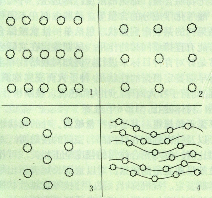 相邻行的植株位置相互错开排列,与隔行树相对,行距与株距相等,或行距略小于株距,分别构成等边或等腰三角形。其优点是,在植株间距离相等的情况下,可比正方形栽植株数增加15%左右,成园和丰产均可相应提早。但因树郁闭提早,管理不方便,现已极少采用(图中3)。