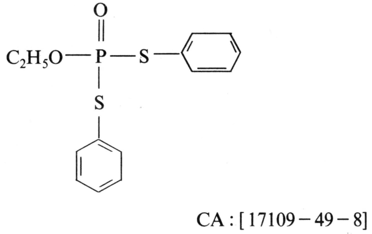 保护性二硫代磷酸酯杀菌剂。商品名Hinosan、克瘟散。化学结构式: 敌瘟磷 1965~1966年联邦德国拜耳公司(Bayer AG.)研制,1967年开发。性能纯品为无色粘稠油状液体;工业品黄色至浅棕色,带有硫醇臭味。沸点为154℃/1.333帕。在70~100℃时,蒸气压9.999×10-4~9.999×10-2帕。难溶于水,易溶于丙酮、二甲苯、甲醇、乙醚、氯仿等有机溶剂。
