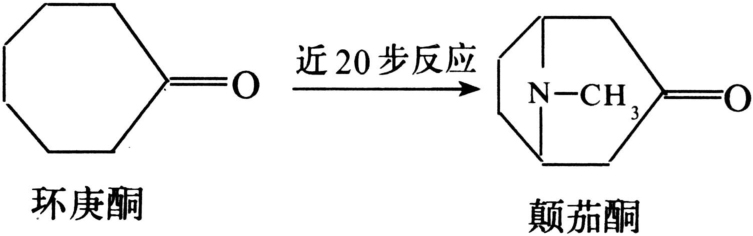 1917年,鲁宾逊(R.Robinson)提出假说:在植物体内颠茄酮是由活泼的丁二醛、甲胺和丙酮反应得来的,三者以水为溶剂,经过一步反应得到颠茄酮: