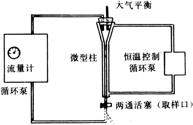 通过淋洗玻璃柱内涂药微球,测定农药溶解度的方法。适用于溶解度<10-2克/升的不挥发性化合物,要求溶解过程中物质性质不变。其原理是将供试农药涂于玻璃微球,装入微型玻璃柱内。用水淋洗,调节水的流速,待流出液中农药含量不变时,据已恒定的浓度值,求出农药的溶解度。(见图)