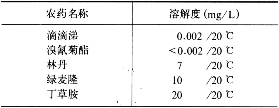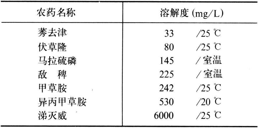 农药的水溶性对农药在环境中的移动性、吸附性、生物富集性以及农药的毒性都有很大影响。水溶性大的农药容易从农田流向水体,或通过渗漏进入地下水,也容易被生物吸收,导致对生物的急性危害;水溶性小的农药,容易被土壤吸附,在环境中不易引起更大范围的污染;水溶性弱、脂溶性强的农药,容易在生物体内积累,易引起生物的慢性危害。
