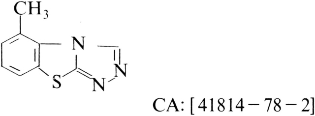 内吸高选择性三唑类杀菌剂。商品名克瘟唑、Beam。化学结构式: 三环唑 1975年美国礼来(Eli Lilly Co.)公司首先开发成功。性能纯品为白色结晶,熔点187~188℃,25℃时蒸气压为266.6448×10-7帕。25℃时溶解度为:水1.6克/升、二氯甲烷33%、乙醇25%、甲醇25%、丙酮10.4%、乙腈10.4%、环己酮10.0%、苯4.2%、二甲苯2.
