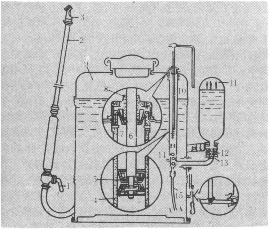 主要由药液箱、滤网、液泵、空气室、输液软管、手持喷杆,开关和喷头组成(图1)。开关采用旋塞式或揿压式。揿压式可以点喷,能节省农药。其余的组成及性能同。药液箱容量一般为10~20升。液泵多为活塞式,也有柱塞式或隔膜式。背负式喷雾器的工作压力为0.25~0.4兆帕。喷雾工作过程与相同。喷施杀虫剂或杀菌剂时,手持喷杆前端安装一个或多个(簇式)圆锥雾喷头;喷施除草剂时,手持喷杆前端还可加装横喷杆,在横杆上按一定间距安装扇形雾喷头。