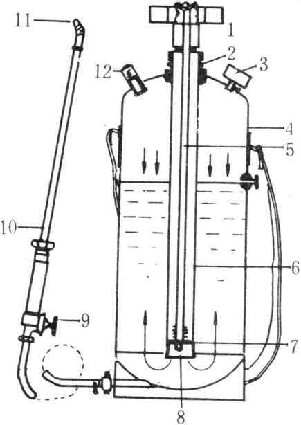 主要组成同背负式,但药液箱坚固密封,兼作气室,改用气泵(图2)。药液箱容量为6~10升,圆筒形,利于单肩背负,药液箱顶部装有排气安全阀。药液箱装入药液后,箱内顶部应留有一定存气空间,起空气室作用。气泵筒的出气活门为单向阀,只允许压缩空气进入药液箱,而药液不能进入泵筒。其喷药工作过程同背负式喷雾器。压缩喷雾器的优点是喷药前先将药液箱内一次充足空气,使药液面上保持有空气压力,作业时不需要随时操作气泵。在作物行中通过性能好。其主要缺点是,在喷药过程中,喷施压力逐渐下降,影响喷量和雾滴尺寸。但在喷杆上加装稳压装置后,可改善其喷雾性能。