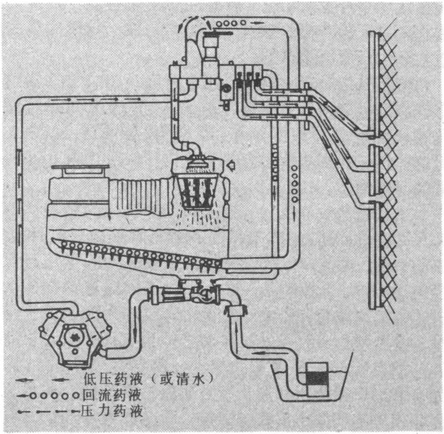 防治果园病虫害时,可采用高压喷枪。其顶端装有可调涡流室深浅的圆锥雾喷头,根据树冠大小、高矮进行调节。喷施压力一般在0.7兆帕以上。(见彩图92)