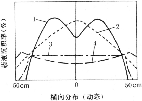 按其沉积雾型又分两种:一是中间药[作业参数:H=50cm;P=3×105Pa;液沉积量大,向两θ=8O°(1、3),110°(2);vF=3.6km/h]侧逐渐递减的常用形式(图2.2),适合安装在水平喷杆上使用,可获得喷幅内药液均匀的沉积分布;二是药液沉积分布近似矩形的均匀平雾式(图2.3),特点是单个喷头喷幅内沉积量均匀,适合于在作业行上进行带状喷药。主要用于喷施除草剂。(见彩图72)