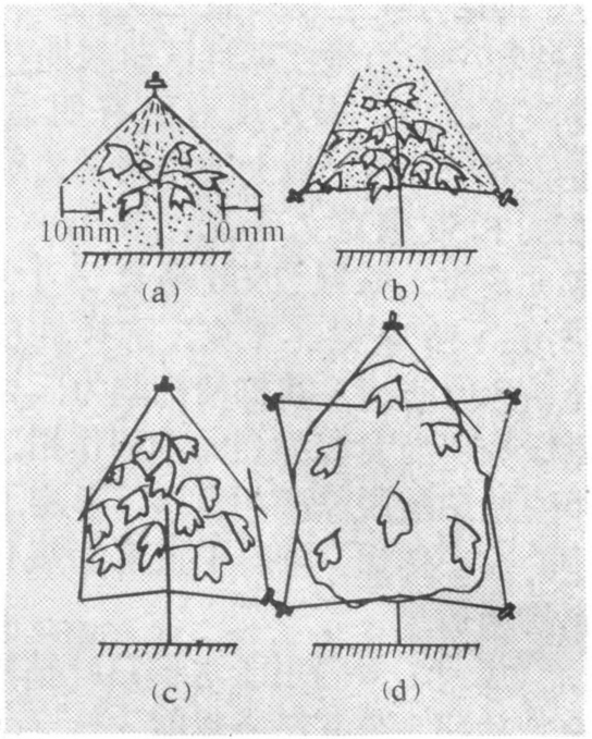 防治大田病虫害时,根据作物形状,生长发育状况和病虫发生或栖息地点,手持喷杆(spray lance)向耙标喷施(图3a),或在水平喷杆(spray boom)上配置多个喷头,从各个角度向靶标喷施(图3b、c、d),常用的喷施压力为0.25~0.5兆帕。