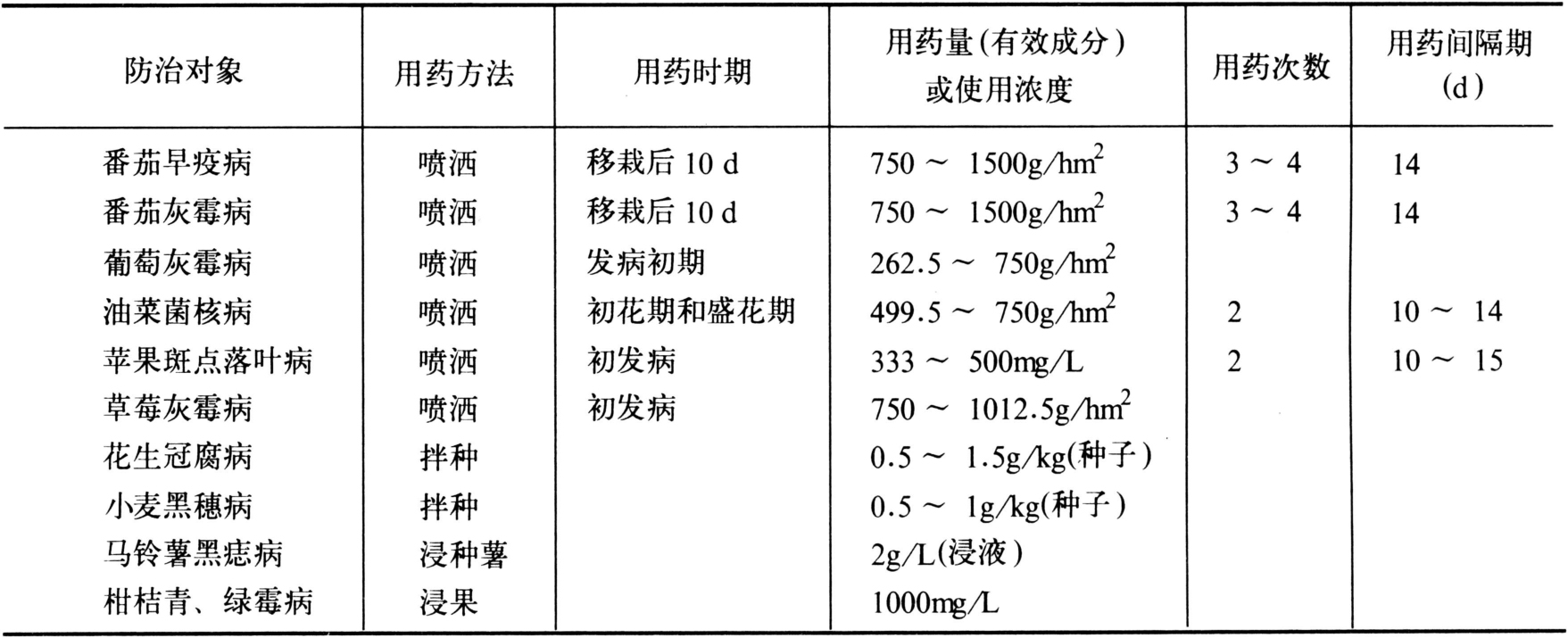 广泛用于防治葡萄、草莓、蔬菜的灰霉病,核果类果树上的菌核病、苹果斑点落叶病、梨黑星病、马铃薯黑痣病等多种病害。(见表)