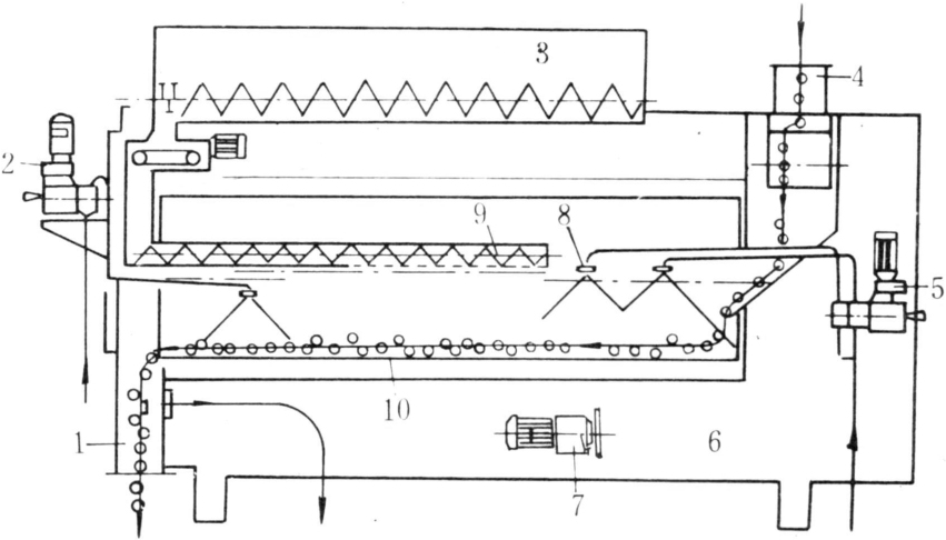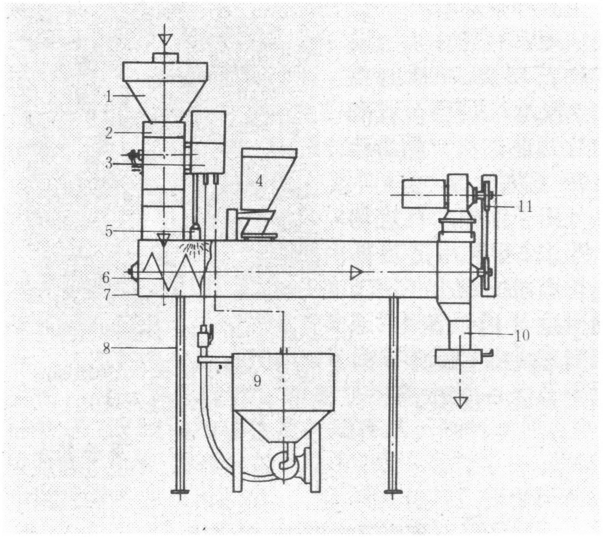 与搅龙式拌药机在结构上的主要不同是以滚筒取代了搅龙(图2)。种子、粉剂、液剂在滚筒中,一面随滚筒的转动沿切向翻转滚动,一面沿滚筒轴向往前运动,逐渐在种子表面形成均匀的药膜或包衣。在滚筒终端,种子从出料口排出,或送入干燥器烘干。