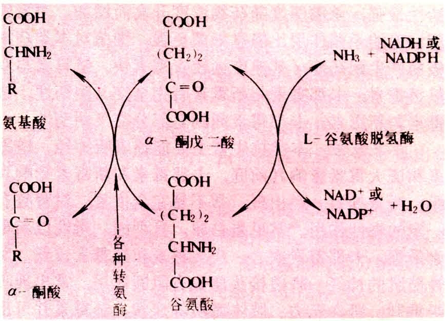 在酶的作用下,氨基酸脱氢生成氨和α-酮酸的过程,称氨基酸的氧化脱氨基作用。在动物体内,催化此过程的最重要的酶是L-谷氨酸脱氢酶,它催化L-谷氨酸脱掉氨基生成α-酮戊二酸和氨。