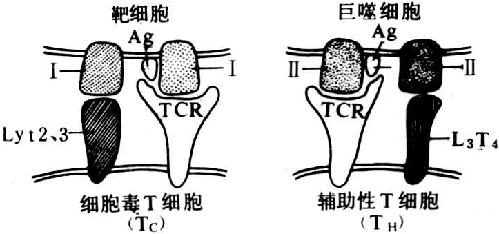 各种动物对所有抗原的免疫应答均受基因控制,这种基因称为免疫应答基因(简称Ir基因),位于主要组织相容性复合体(MHC)内。Ir基因对免疫应答的调节控制是通过T细胞的特异激活以及免疫系统中T细胞与其他细胞的相互作用而完成的。与Ir基因现象有关的除MHC Ⅱ类抗原(Ia抗原)外,还有MHC Ⅰ类抗原,它们与抗体识别自身和非自身的能力有关。T细胞在分化过程中出现对自身MHC抗原的受体,但只在带有对自身MHC抗原有低亲和性特异受体的T细胞才能从胸腺移行出去。在抗原提呈给辅助性T细胞(TH)时受MHC Ⅱ类抗原限制,在细胞毒性T细胞(Tc)杀伤靶细胞时则受MHC Ⅰ类抗原限制(图1)。由于MHC抗原的高度多态性,所以不同个体对选定抗原产生免疫应答和免疫疾病的能力不同。同一抗原作用于不同个体时,某些个体因具有某种MHC单型体而成为应答者,另一些个体则因MHC单型体不同而可能为无应答者。