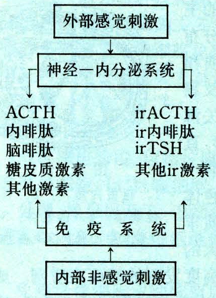 神经内分泌系统和免疫系统都能产生ACTH和内啡肽等多肽因子,又都具有相应的受体,它们构成了两个系统相互联系的桥梁和相互交流信息的通道。因此,J.K.布莱洛克(Blalock,1985)等提出一种新的假说,免疫系统也可以像神经系统那样具有感觉机能,并可将感受到的刺激通过共同的多肽因子与神经内分泌系统相互交流信息。他们将淋巴细胞比作能在体内到处巡游的感受器。感受不能被神经系统感知的抗原刺激,在引起免疫应答的同时,通过释放免疫递质,将感受到的信息传给神经内分泌系统,而神经系统感受到的情绪因素和理化刺激等,则通过神经递质和多肽因子传递给神经内分泌系统。二者相互交流,密切协作,共同维持着机体内部环境的稳定。