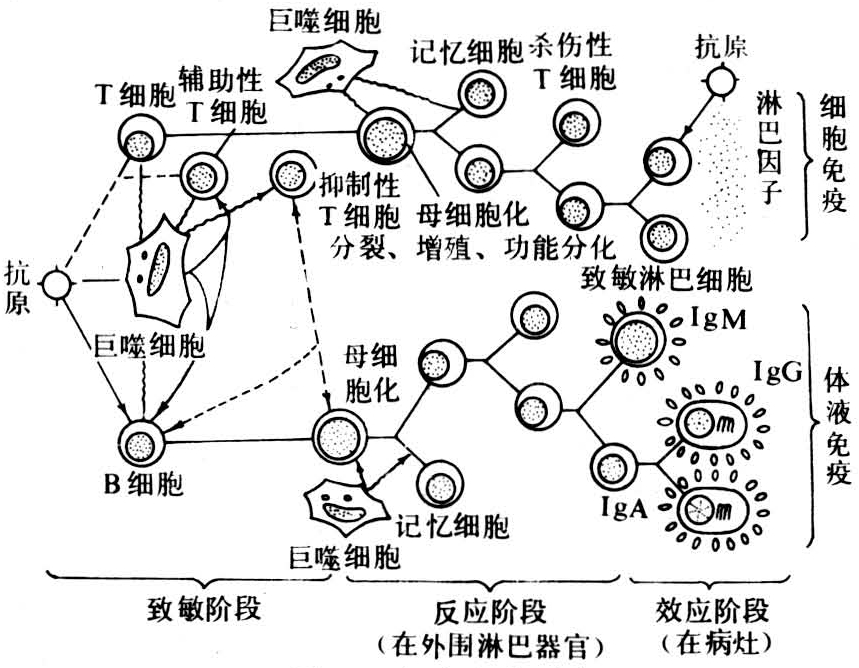 以及T、B细胞对抗原的识别。即从抗原进入体内起,到免疫活性细胞被激活前的过程。反应阶段免疫活性细胞识别抗原后,T、B细胞活化、增殖、分化至产生致敏淋巴细胞和抗体的过程。效应阶段抗体、致敏淋巴细胞和记忆细胞在再次接触抗原时,发挥免疫效应,破坏和清除抗原的过程。