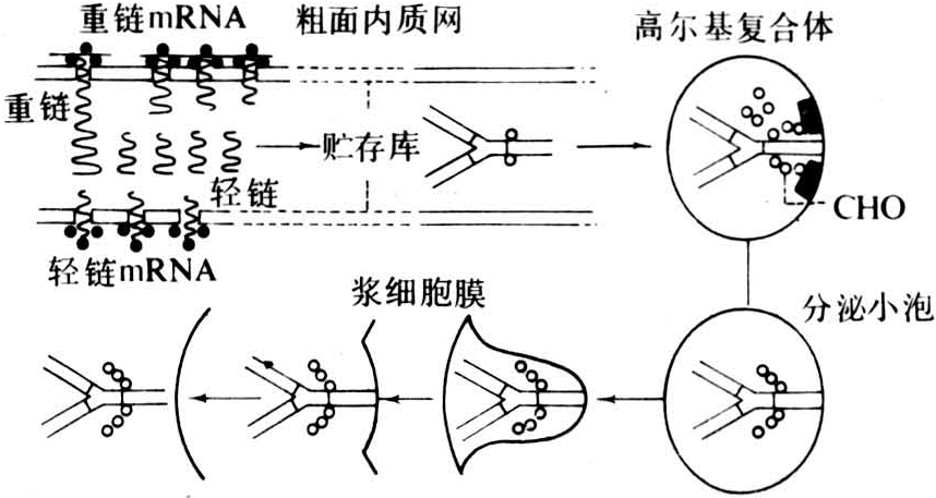被抗原选择性活化的B细胞核内的抗体基因,经重排连接后分别转录和剪接形成轻链和重链的信息RNA(mRNA),mRNA进入胞浆内粗面内质网的核糖体上,分别合成轻链和重链,装配成免疫球蛋白,从粗面内质网转运至高尔基复合体进行糖基化;然后分泌至细胞外(图2),发挥免疫效应。