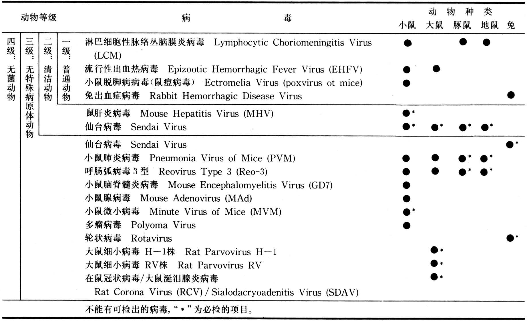 表2-2 实验动物猫、犬、猴的病毒检测等级标准