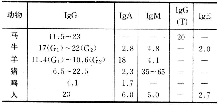 动物刚出生时,肠道对蛋白质的渗透性最高,约24小时后则降到很低水平。仅在出生后12~24小时之间,幼畜血清中Ig水平就可接近母体。吸收停止后这种获得的母源抗体将通过分解过程立即开始下降,各种Ig下降的速度有所不同(表3)。下降到不能保护机体的水平所需时间取决于它们原来的水平,如雏鸡的母源抗体半衰期为4.1天,出生时若新检疫的血凝抑制抗体为6log2,则12日龄时可降到3log2以下的临界免疫水平。