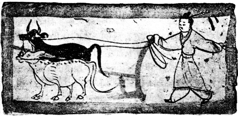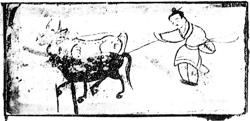 中国北方旱地一项配套的土壤耕作技术体系。这种翻耕法,大约是在秦汉至魏晋南北朝时期逐步形成和发展起来的。它的基础是翻耕,翻耕的前提条件是使用有壁犁,中国大约是在秦汉时开始使用大型三角犁铧和犁壁的。在犁铧上安装犁壁之后,不仅使耕犁的松土和碎土能力大为提高,而且使耕犁具有了翻垡的功能,从而为实行翻耕法奠定了基础。实行翻耕法还必须在翻耕后配合以适当的整地作业才能使农田土壤达到地面平整和土块细碎的目的。秦汉时代在翻耕后主要是用“摩”来磨平地面和磨碎土块,中所说的“平摩其块”或“摩平以待种时”就说的是翻耕后的整地作业。但是,实践表明,仅仅依靠“摩”这种整地工具还不能保证达到整平磨细的目的。为了提高整地质量,人们又经过一段时期的研究和探索,大约在魏晋南北朝时期,又发明了铁齿耙这种整地工具,于是翻耕法才逐步形成了耕后有耙,耙后有耱这种耕、耙、耱三位一体的耕作体系。人们可以从嘉峪关魏晋墓室画像砖上清晰地看到当时“耕耙耱”的生动形象(见图1~3)。