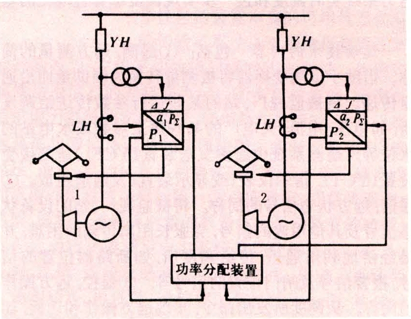 调节的任务是维持系统频率为给定值,并按经济原则在电厂和机组之间分配有功功率,保持系统中电钟的准确性。①主导发电机调节法。调频电厂装设无差调频器的发电机,即为主导发电机,其他发电机装功率调节装置,使其输出功率与主导发电机的功率保持一定比例。主导发电机调频系统如图4,当系统负荷功率变化,频率即变化,主导机组调频器先动作,改变主导机的功率.其他机组功率和主导机间功率比例关系被破坏,功率调节器动作,恢复原比例关系。在功率调节过程中,系统频率随着又改变,引起主导机功率改变,不断校正系统频率,至调节终止,Δf=0、P2=α2·P1、P3=α3·P1…条件得到满足。调节过程较缓慢,适用于中、小容量电力系统调频。②虚有差调节法(图5)。将变动的负荷功率按比例分配给各调频机组,使系统频率维持给定值。因在调节过程中是有差,而调节结果是无差的,故称为虚有差调节。在调节过程中因各机组调速器动作不一致,机组功率与分配装置给出功率不可能完全一致,所以系统频率将有波动,而调节终止可维持为给定值。③虚无差调节法。虚有差调节使系统会出现频率偏差,于是在虚有差法中,分出一台机组按无差特性调节。最后该机组承担按分配系数分配后所剩余的功率,使系统频率维持给定值。④按经济原则调节法。理想的自动调节应该是既满足系统要求,维持频率给定值,又使有功功率分配符合经济原则,也就是供给负荷的同时,系统燃料消耗最少。系统机组间按等微增率分配负荷是最经济的。微增率为输入耗量微增量与输出功率微增量的比值,实现等微增率准则经济分配负荷,不仅可维持频率为给定值,将负荷的变动按经济原则分配给调频机组,且因频差积分可取自系统中的任一点,因而参加调频的电厂可以更多,有利于系统经济运行。此外即使调节装置存在失灵区,当频率积差超过失灵区时,调节装置即行动作,系统中电钟的准确性可以得到保证。由此可见各种调频方法,在50年代是模拟式自动调频及负荷经济分配系统;而现代则是利用电子计算机实现自动调频及经济调度。