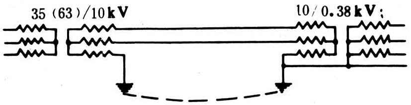 式中 Ifz为共用同一接地装置的各条两线一地出线的总负载电流(安);R为共用接地装置的接地电阻(欧)。上式中忽略了负荷侧配电变压器接地电阻上的电压损失(其值小于20伏)。