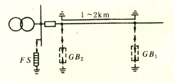距发电厂1~2千米的地段称为进线保护段(见图)。不沿全线架避雷线的线路应在进线保护段架设避雷线,沿全线架设避雷线的线路,在进线保护段应提高线路的耐雷水平,目的是防止在近区发生雷击事故。排气型避雷器GB1仅在木杆或木横担线路上装设,目的是限制侵入波幅值。而当线路开关在雷雨季节经常开路运行,且线路对侧有电源时才装设GB2,目的是保护线路开关。