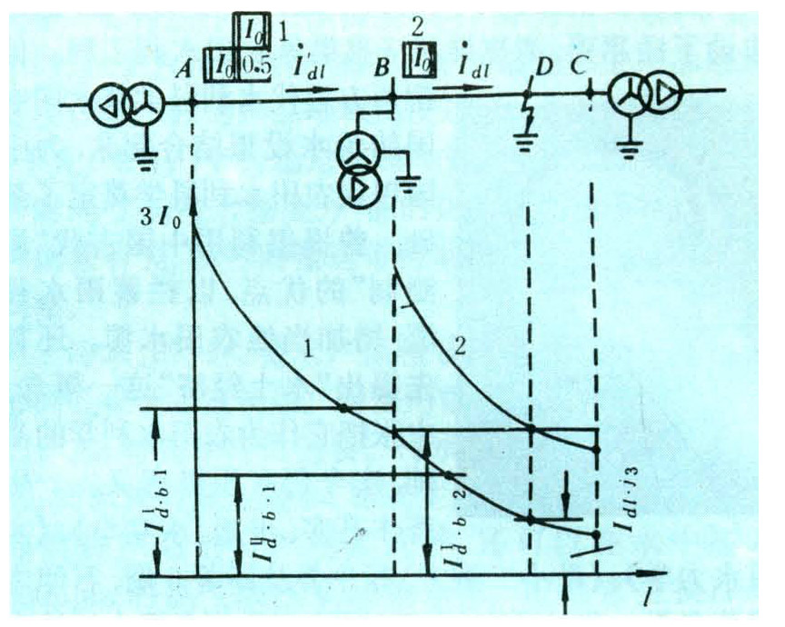 反映零序电流增大瞬时动作的零序电流保护。当线路发生接地短路时,三倍零序电流3I0沿线路长度而变化(图1),保护安装于A、B点。为保证动作的选择性,下段线路首端故障时它不动作。其动作电流按大于本线路末端接地短路时,通过保护安装处的最大零序电流的3倍整定,即Idz0=·3I0,式中K′K为可靠系数,一般取为1.2~1.3。其保护范围小于被保护线路的全长。