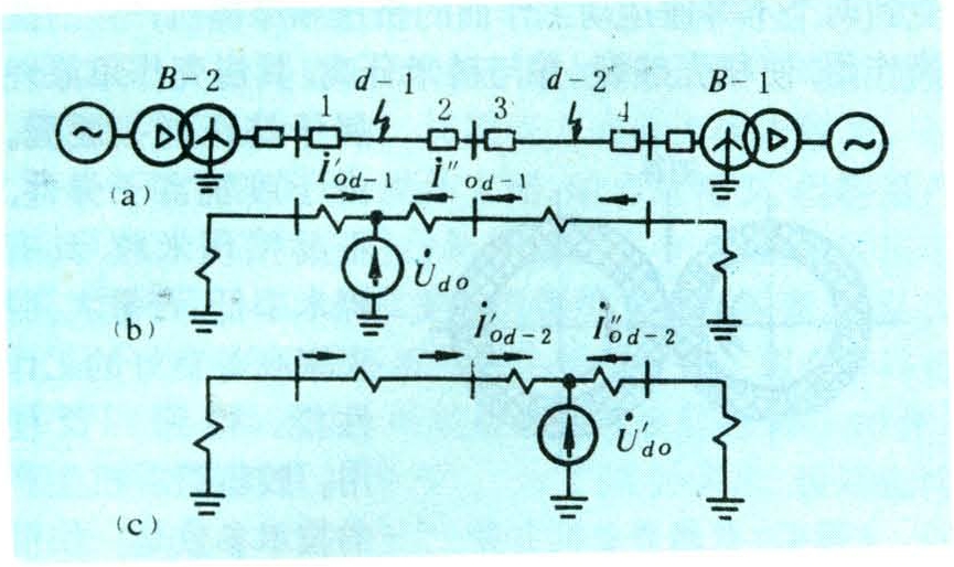 式中为可靠系数,取为1.1~1.2;Ido.xd为下一段线路保护装置2的Ⅰ段末端D发生接地短路时,通过本保护装置的3倍零序电流计算值。该保护的保护范围为被保护线路的全长。
