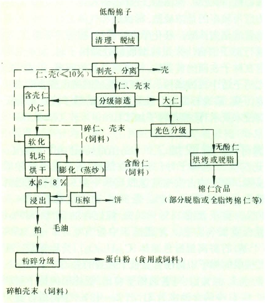 普通棉子中含有棉酚有毒物质,必须脱毒后方可食用或作饲料。从饼粕中提取的棉酚可用于医药或其他工业。主要有三种棉子脱毒方法:①高温水热处理法(如蒸炒、压榨、蒸脱烘干等)。可使有毒性的游离棉酚与蛋白质中氨基酸等化合成毒性低的“结合棉酚”,但蛋白质同时变性使营养成分有所损失。②溶剂浸出法。即利用混合溶剂(如乙醇-己烷、丙酮-己烷、二氯甲烷-己烷等)进行选择性低温浸出,将油脂与游离棉酚和蛋白质等进行有效的分离。③化学添加剂法。例如把硫酸亚铁、碱液或者尿素等添加剂加到饼粕中,使棉酚破坏或变成结合状态,通常应用于饲料饼粕。此外,尚有发酵处理法,旋液分离色腺体法等,可供选用。