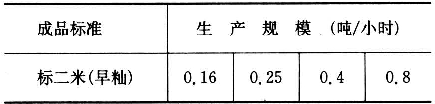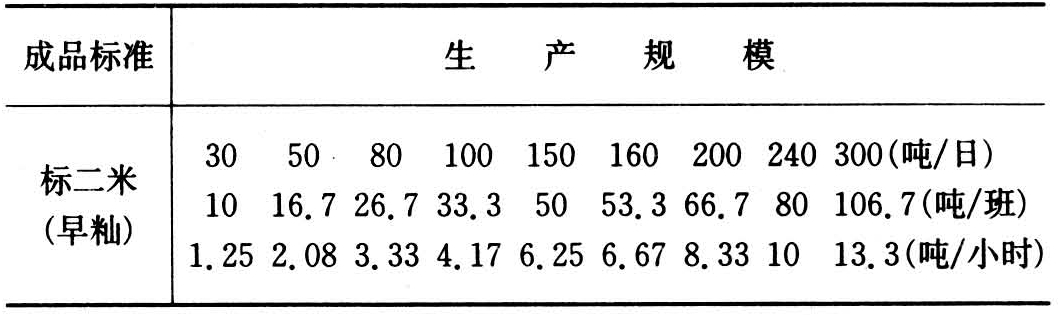 应根据设计任务书和国家颁布的设计标准进行设计。中国部颁设计标准中规定,碾米厂或大米车间的生产规模,应以早籼标二米30吨、50吨、80吨为基础,更大的规模可为上述规模的倍数,见表1。更小的生产规模,可按单机或组合机产量表示,见表2。