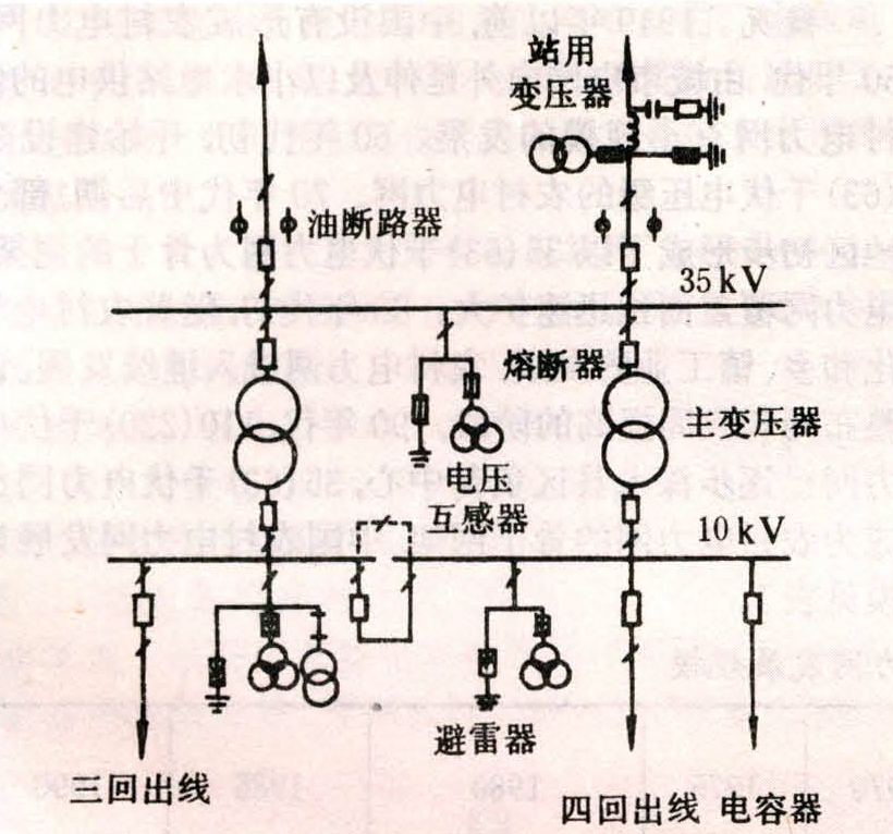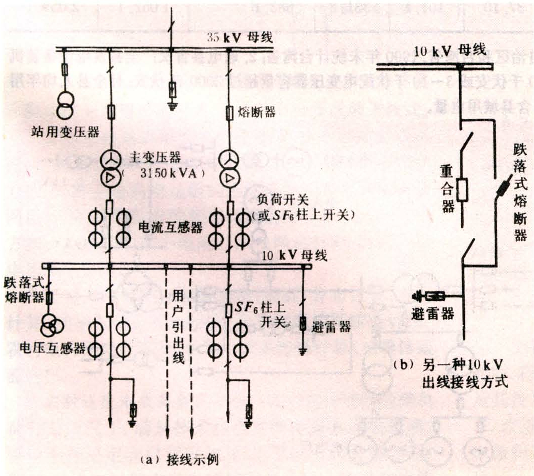由高压电器设备通过连接线组成的接受和分配电能的电路,又称一次接线或电气主系统。用规定的设备文字和符号,按其作用依次连接的单线接线图,称为主接线图。它不仅标明各主要设备的规格、数量,而且反映各设备的作用、连接方式和各回路间相互关系,从而构成变电站电气部分的主体。它直接影响配电装置的布置、继电保护的配置、自动装置和控制方式的选择,对电力系统运行的可靠性、灵活性和经济性起着决定作用。①110千伏农村变电站电气主接线如图1所示。图中110千伏侧为外桥形接线。若110千伏线路中无穿越功率,变压器在经常切换、线路较长或故障率较高时,可改为内桥接线(连接桥与跨条换位)。110千伏侧有3~4回出线时,一般改用单母线分段接线方式。主变压器容量不大时,有些国家采用熔断器(不超过10兆伏安)或用接地隔离开关和快分隔离开关(不超过16兆伏安)代替主变压器断路器的简易接线方式,中国则很少采用。变电站的35千伏侧有4~8回出线、6~10千伏侧有6回及以上出线时,用单母线分段接线方式;出线回数较少时,用单母线接线方式。图1中35千伏侧及10千伏侧均为单母线分段接线。②35(63)千伏农村变电站电气主接线(图2)的35(63)千伏侧采用单母线接线。若仅有一路进线时,35千伏线路侧可不装断路器;若仅有一路出线且无分支线时,可采用线路变压器组单元接线方式,35(63)千伏线路侧、变压器侧都不装断路器。6~10千伏侧视出线回路数多少,采用单母线(6回以下)或单母线分段(6回及以上)接线方式。分段断路器也可用隔离开关代替。站用电源由35(63)/0.4千伏及10/0.4千伏站用变压器供电,其中35(63)/0.4千伏站用变压器接于进线隔离开关外侧,以保证控制、保护用电的可靠性和全站停电时检修、试验用的电源。③小型化农村变电站单台主变压器容量一般不超过3150千伏安的电气主接线如图3所示。35(63)千伏侧采用户外可控气吹断路器,主变压器10千伏侧采用负荷开关或柱上六氟化硫(SF6)断路器,10千伏出线采用柱上六氟化硫断路器或真空断路器或六氟化硫(真空、油)自动重合器。当10千伏出线采用自动重合器时,应与线路上的自动分段器相配合。该种变电站站用电源同②。