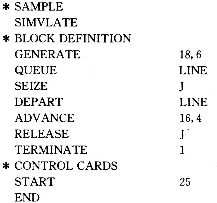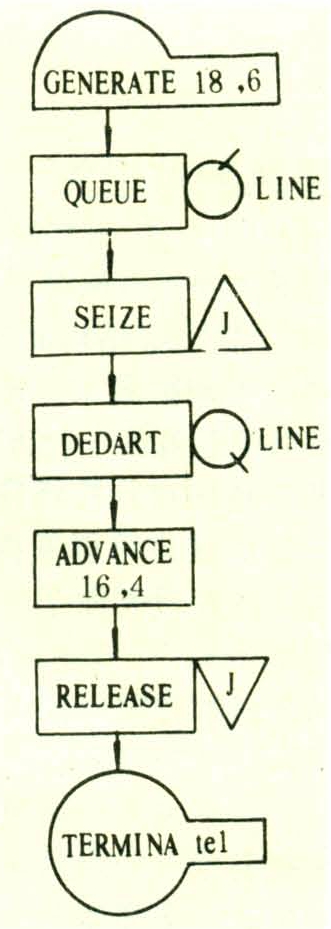 程序中的*号行为注解行,SIMULATE语句表示模拟开始,END语句表示模拟结束,START语句表示控制模拟的长度(这里为25个动态实体),用以控制终止计数器。顾客(动态实体)以平均值为18分钟,偏差为6分钟的均匀分布产生,然后进入到排队线为A的队列中。如服务台J(设备)空闲,则顾客离队得到服务,顾客进入服务台得到服务时被延迟一段时间,其平均值为16分钟,偏差为4分钟。服务完毕顾客释放服务台。顾客离开,终止计数器减1。
