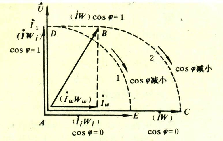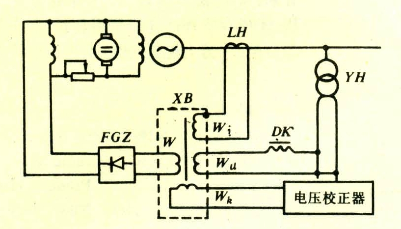 的和,可见功率因数减小时,合成磁势增加,因而XB的副边输出电流随之增大。但考虑非线性和温度的影响,一般相位复式励磁装置都带有电压校正器,相复励变压器XB的控制绕组Wk接受校正器输出的直流电流,以控制铁芯饱和程度而改变XB的激磁阻抗,使原边的合成磁势转换到副边也随之而变。校正器输出电流小,激磁阻抗增大,副边磁势也增大;反之减小,从而起到调节电压的作用。