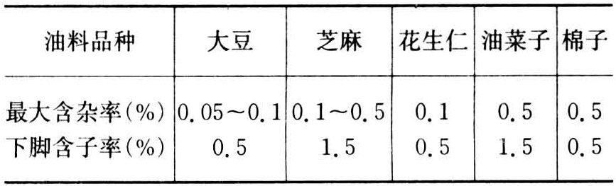 清除油料中的杂质。根据杂质与油料的不同物理性质,确定有效的清理方法,常用的有筛选、风选、磁选和水选等方法。这些方法可以单独采用或综合应用,如芝麻采用水洗与筛选结合的方法去除并肩泥;又如油棕壳仁分离采用б重为1.16~1.13的泥浆水或盐水,利用壳、仁在水或盐水(海水)、泥浆水中的浮力不同进行分离。一般采用处理后油料的最大含杂率和杂质下脚含子率衡量清理效果(表1)。