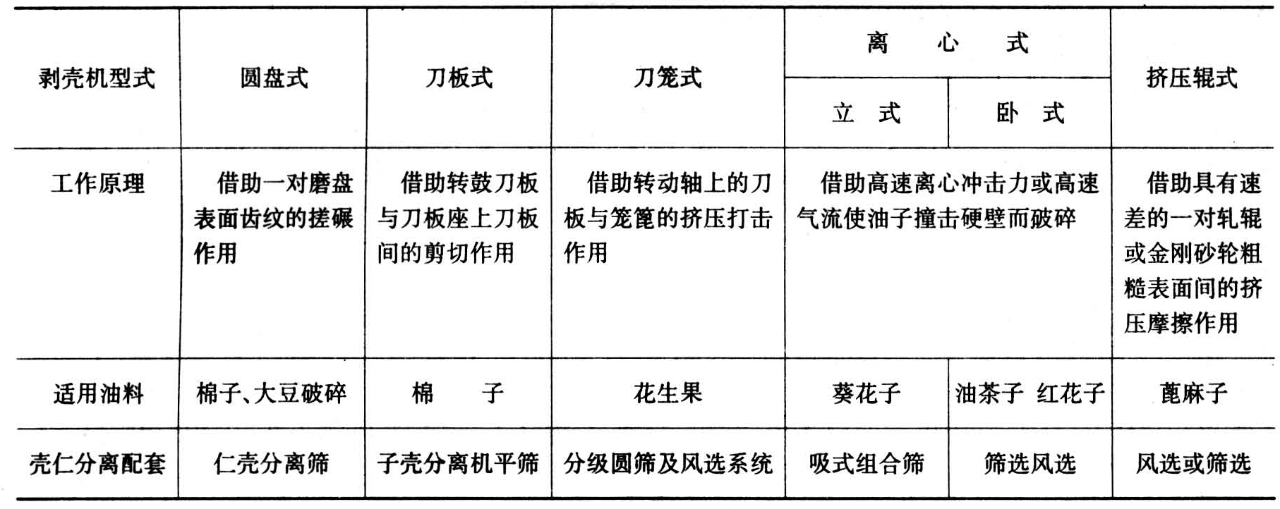 利用壳、仁结构性质的不同,借助搓碾、剪切、撞击或挤压的原理进行壳、仁有效剥离,剥壳后的仁壳混合物通常采用筛选、风选或组合分离设备进行清理。衡量剥壳效果的标准是:①剥壳率高而碎仁率低;②剥壳后仁中含壳率,视制油工艺而定,如预榨、浸出工艺规定棉子仁、向日葵子仁中含壳不超过10%,花生仁含壳在1%以下;③剥壳后壳中含仁率要低,如棉子、花生不超过0.5%,向日葵子低于1%。为提高剥壳效果宜选择合理的剥壳设备与壳仁分离配套措施(表2);调节剥壳前油料的最佳水分,如向日葵子、红花子7.5%~8.5%,棉子10%~12%,花生果、大豆9%~10%,油茶子12%~18.5%,油桐子9~15%。