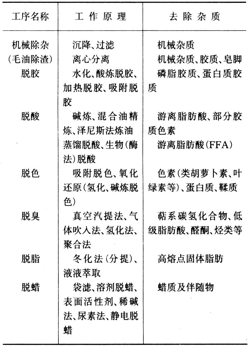 油脂精炼方法主要有四种:①机械精炼,用沉淀、过滤或离心分离等方式,除去毛油或半精制油中的机械杂质(如饼渣、泥砂或白土)以及部分胶溶性杂质。②物理精炼,利用甘油三酸脂与游离脂肪酸不同的挥发性能,在高温、高真空条件下,采用水蒸汽汽提以除去游离脂肪酸。③化学精炼,在油脂中加入某种化学物质,以进行化学反应而达到精炼的目的。例如碱炼、酸炼、酯化、氢化、氧化还原与混合油精炼等。④物理化学精炼,使油脂中杂质产生物理化学反应,以除去杂质的一种方法,如水化、吸附脱色、脱臭、萃取以及冷冻结晶(冬化)等。此外,尚有新兴的生化法精炼技术,例如应用酶法选择性脱酸;利用1.3脂肪酶使FFA转化成中性甘油脂而脱酸等。按精炼的工序,将油脂精炼的目的和工作原理见表。