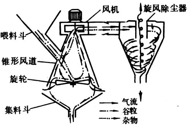 旋轮式清选机是利用物料各自在气流中飘浮速度不同而进行分选(图2)。由于采用了旋轮,可克服短茎杆和轻的种子长轴处于铅垂位置时难于飘起,影响分离效果的缺点。工作时,物料进入锥形风道下部的叶轮中部,这时上部风机产生的气流,一方面在物料下落过程中吸走部分轻杂质,另一方面较强的气流使叶轮旋转,落在叶轮中部的物料,在离心力作用下均匀松散作径向运动,并使短茎杆处于横卧位置,增加迎风面积,使其分离,而种子落向集料斗。