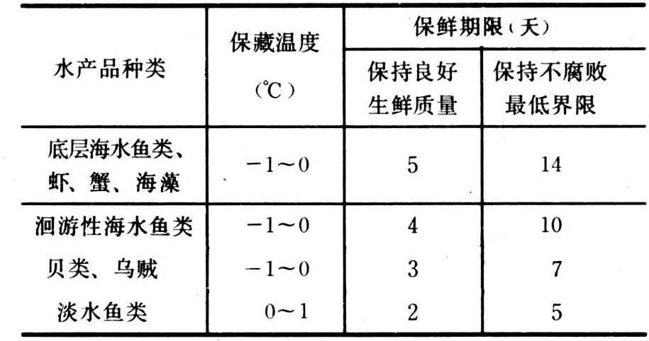 冷藏 低温保鲜的作用主要是利用低温对各种微生物、酶类以及氧化反应等的抑制以达到防止腐败和变质的目的。一般是温度越低,抑制作用越大。微生物和酶类等的种类不同,可能被抑制的温度范围也不同。鲜水产品的腐败菌中有适于在各种温度下生长繁殖的种类,分为高温菌、中温菌和低温菌。在低温下,高温菌和中温菌类大多被抑制或停止繁殖,但低温菌仍能繁殖。低温菌繁殖的温度范围难有一致的界限,一般把使用普通培养基在0℃温度下两星期以内能够繁殖的菌类,称为低温菌。低温菌生长的最适温度约在20~35℃,或者略低于30℃。到0℃以下,随着温度的降低,增殖速度显著下降,停止增殖的最低温度为-10℃左右。鱼体常见的低温腐败菌类有假单胞杆菌属、弧菌属、摩氏杆菌属、黄杆菌属、小球菌属、棒状菌属等。图1是无色杆菌属在常温和低温下的繁殖速度。从图1看出,细菌在0℃温度下,有2~4天极为缓慢的生长停滞期,在这以后即进入迅速增殖的所谓对数期。-4℃的增殖曲线较0℃缓慢得多。温度在0℃时,多数鲜水产品能保持良好生鲜质量的期限仅2~5天,保持不腐败的最低期限为5~14天,并依水产品的种类而有所不同(见表)。所谓保持良好的生鲜质量期限大体相当于鱼体死后僵硬期,这和鱼体死后腺苷三磷酸(ATP)的分解和肌苷酸(IMP)的积蓄与分解有关。在常温条件下ATP和IMP的分解很快,僵硬期很短。但在低温保藏条件下,由于ATP和IMP的分解酶类活性被抑制,结果是鱼体死后的僵硬期和IMP的积蓄时间增长。所谓保持不腐败的最低期限是指鱼体因细菌分解达到初期腐败前的期限。在这一保藏期内,除鲐、鲱、沙丁鱼等多脂鱼类之外,不存在脂肪因氧化引起变质的问题。