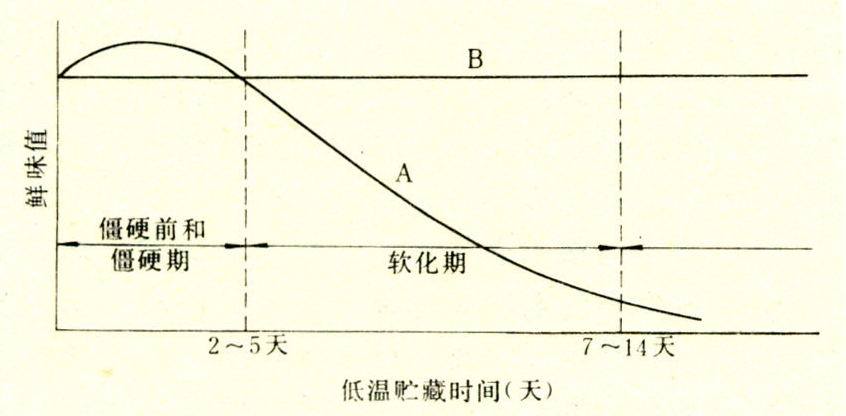 冻藏 鱼类等水产品冷冻保鲜的温度一般在-18℃以下,有的甚至采用-30℃的冻藏温度。采用-18℃冻藏温度,可以无例外地使一切低温菌类停止繁殖,但并不能使它死灭。因此在解冻后温度上升时,仍易恢复繁殖,影响品质。冻结对于微生物的抑制,除了低温的作用之外,还有因细胞组织中水分结冰使水分活度下降产生的抑制作用。水分冻结引起的水分活度下降是和冻结温度的下降一致的。如一般鱼体在-5℃时的水分活度为0.956,而降到-15℃和-30℃时的水分活度则分别为0.864和0.75。冻藏中的鲜水产品,由于-18℃以下低温对细菌腐败的有效抑制,它的保藏期可达数月甚至数年。在这种冻藏温度下,决定保藏期长短的因素不是细菌腐败,而是脂肪氧化、干缩,或者蛋白质变性。脂肪氧化是缩短多脂鱼类和中脂鱼类冻品贮藏期的主要原因。一般在-18℃甚至-30℃的温度范围并不能完全抑制鱼体脂肪的氧化变质。如少脂鱼在-18℃和-30℃的保藏期分别为10~24个月以上,而多脂鱼则分别为4~12个月。冻藏低温下对于一般酶类有明显的抑制效果。如对冻藏鱼体的肌苷酸分解酶活性的抑制,可以使冻藏中鱼体肌苷酸不被分解而保持其在冻结前的良好鲜味。图2中曲线A表示0℃贮藏鱼体的鲜味在僵硬期高于冻品,在僵硬期以后则逐渐下降;曲线B则表示冻藏鱼体的鲜味虽然不如僵硬期中的冰藏鱼体,但它可以把冻结时原料鱼的鲜味一直保持下去。
