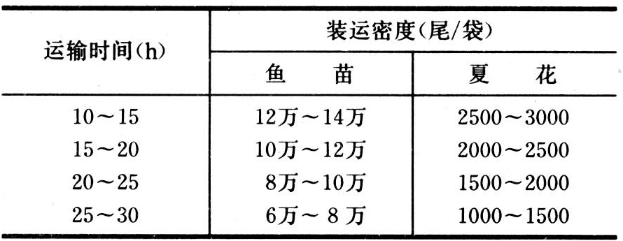 开放式运输 盛鱼于帆布篓、木桶、帆布袋箱等敞口容器中。盛鱼密度依水温、运程、鱼的种类、规格、体质和运输技术而定,一般每只篓、桶装鲤科鱼类鱼苗30万~40万尾,装夏花和鱼种的密度参照表1。