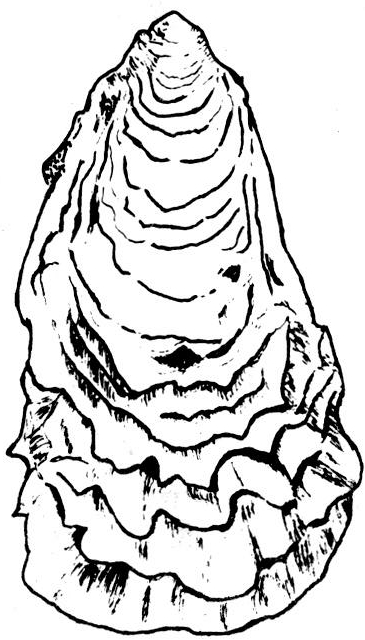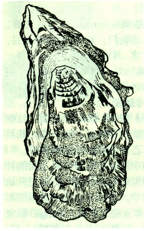 长牡蛎 壳大,呈长三角形或窄长方形,但也有长圆形个体(见彩图226)。右壳扁平,环生波纹状薄鳞片。左壳稍凹,鳞片较右壳更粗大,壳顶附着面小,韧带槽宽大而长。贝壳内面白色,闭壳肌痕大,棕黄色。